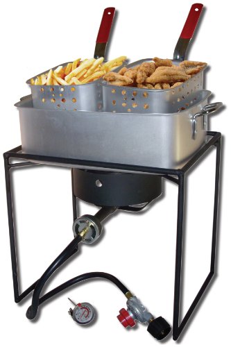 | Heavy Duty Rectangular Portable Propane Outdoor Cooker, 16-Inch Tall with Recessed Top for Safety and Four Legs for Stability, 54,000 BTU Cast Burner, Rectangular Aluminum Fry Pan with Two Baskets with Heat Resistant Handles, Listed LP Hose and Regulator with Type 1 Connection, Deep Fry Thermometer, Instruction/Recipe Booklet, CSA Design Certified. ...Read more |